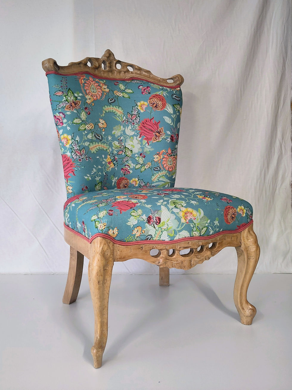 Réfection complète et moderne en mousse, finition clous décoratifs a l'arrière du dossier et sur l'avant et les cotés de l'assise.